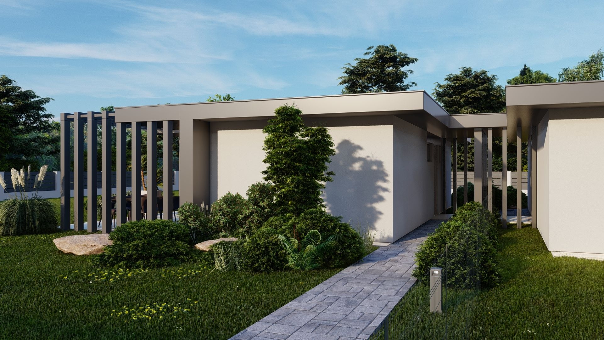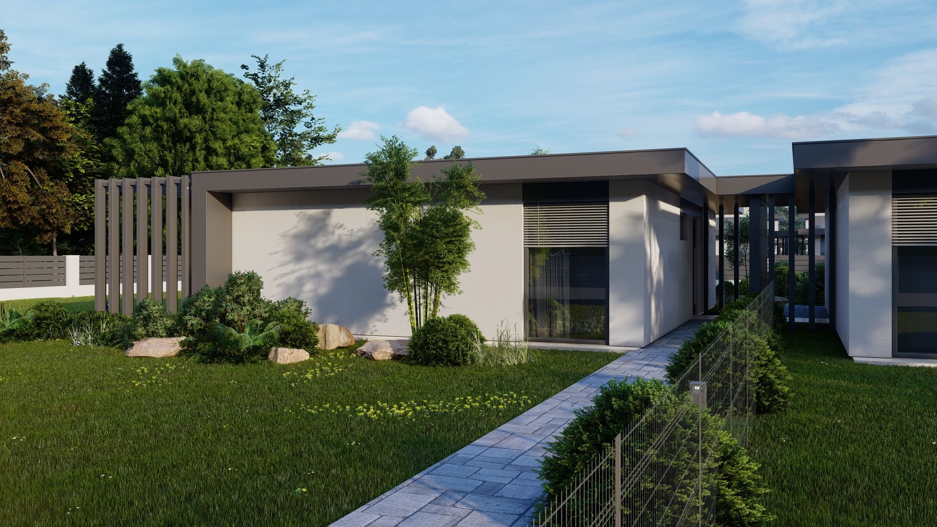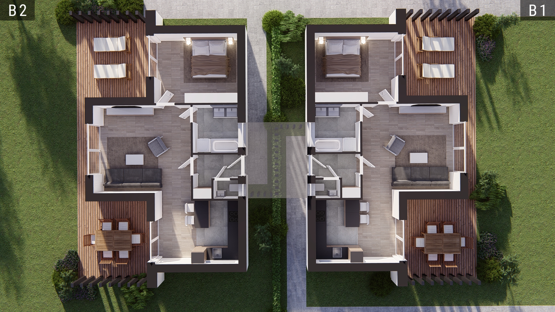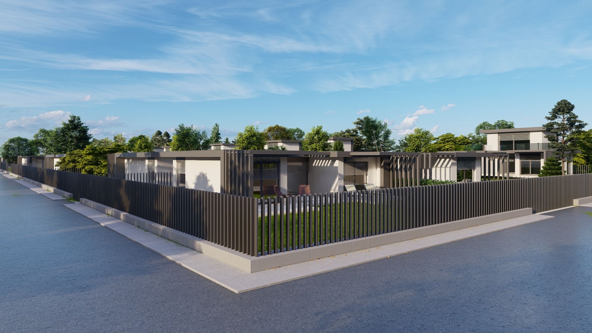 Telkenként (720-800 nm) kettő egyszintes ingatlan épül, saját használatú, intim kertrésszel (306-414 nm), autó beállóval, külön bejáratú megközelítéssel. Az épületek egymás között fallal nem kapcsolódnak, összekötésük pergolás, modern kialakítással megoldott.