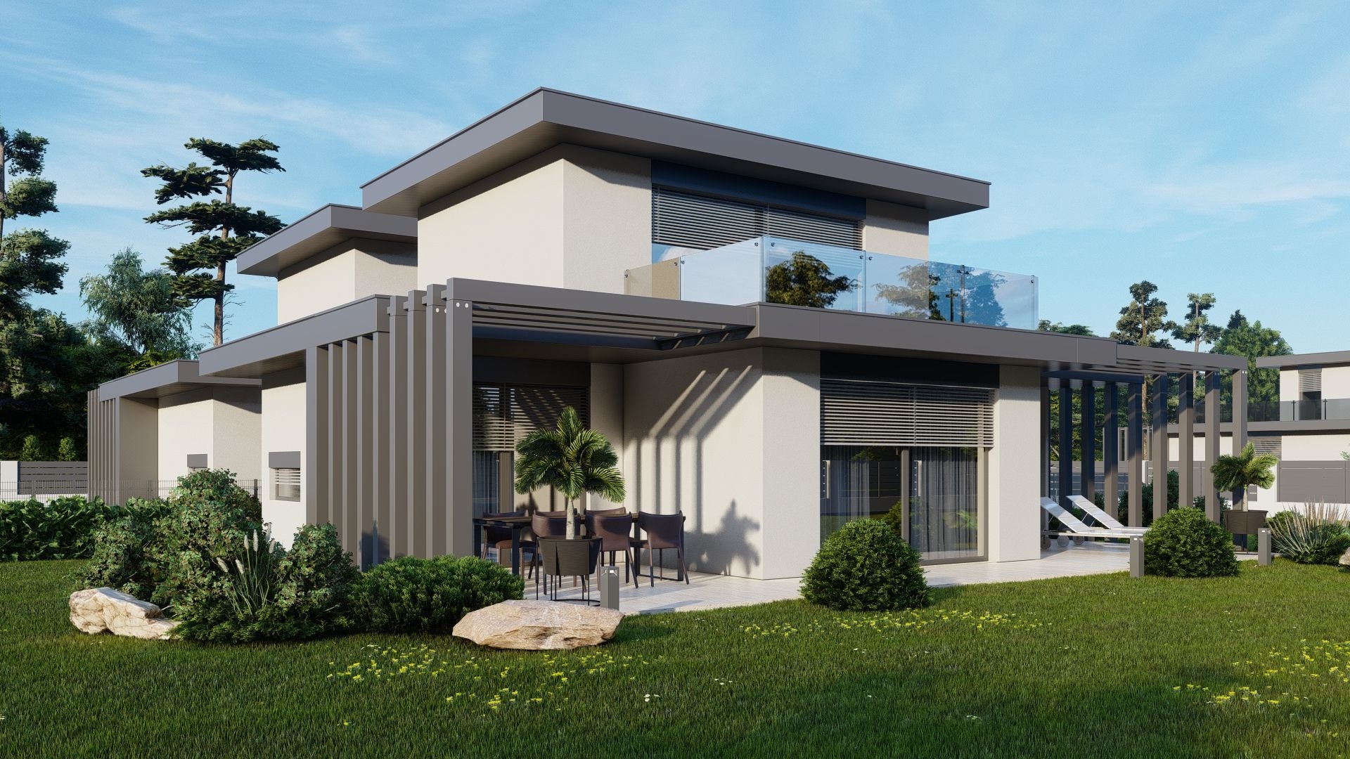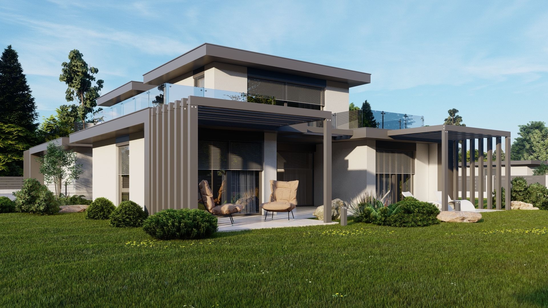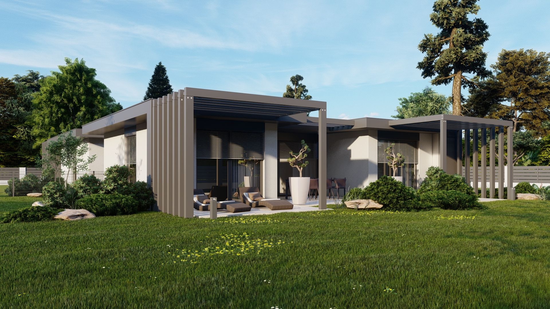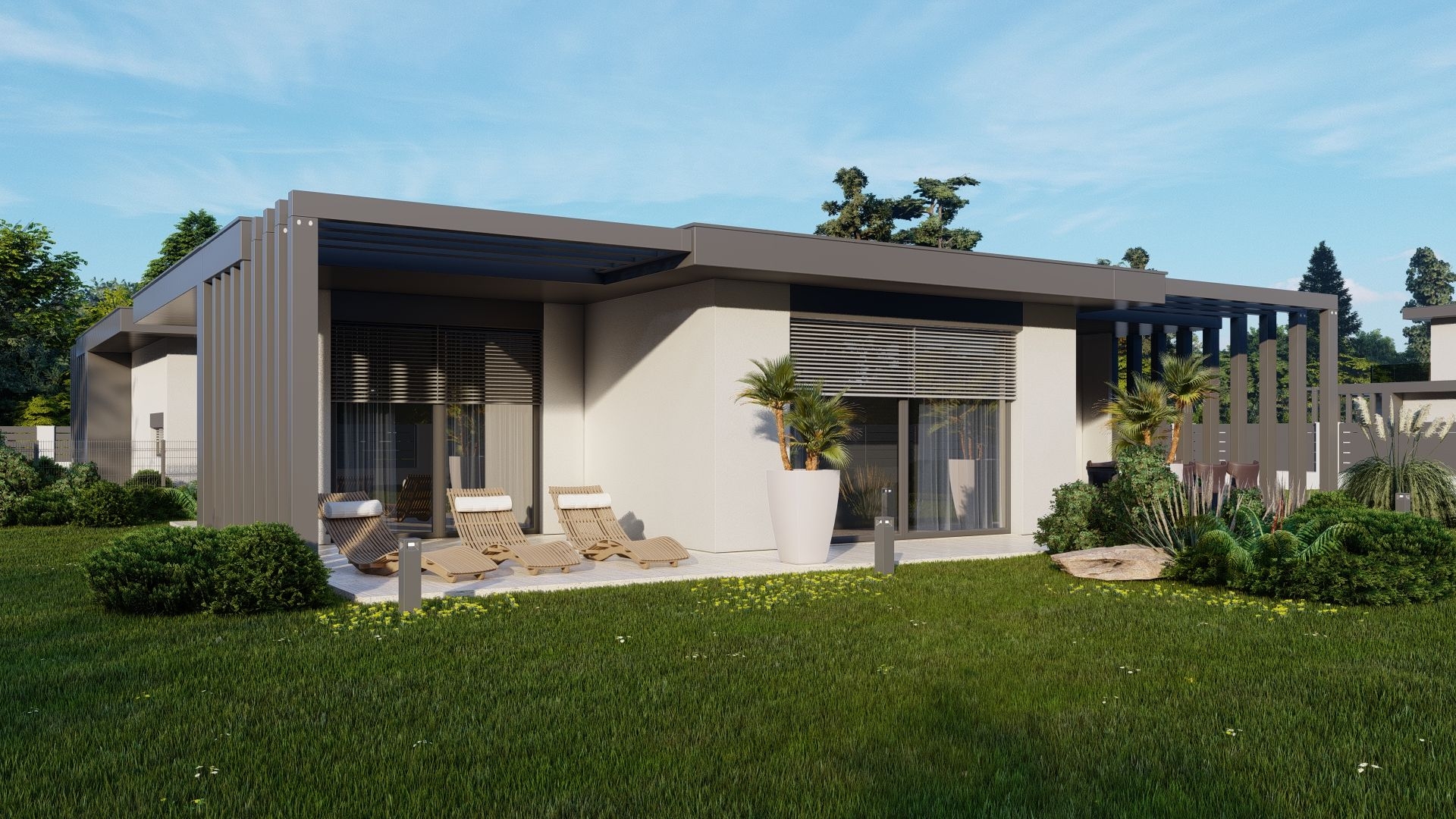 Telkenként (720-800 nm) kettő egyszintes ingatlan épül, saját használatú, intim kertrésszel (306-414 nm), autó beállóval, külön bejáratú megközelítéssel. Az épületek egymás között fallal nem kapcsolódnak, összekötésük pergolás, modern kialakítással megoldott.