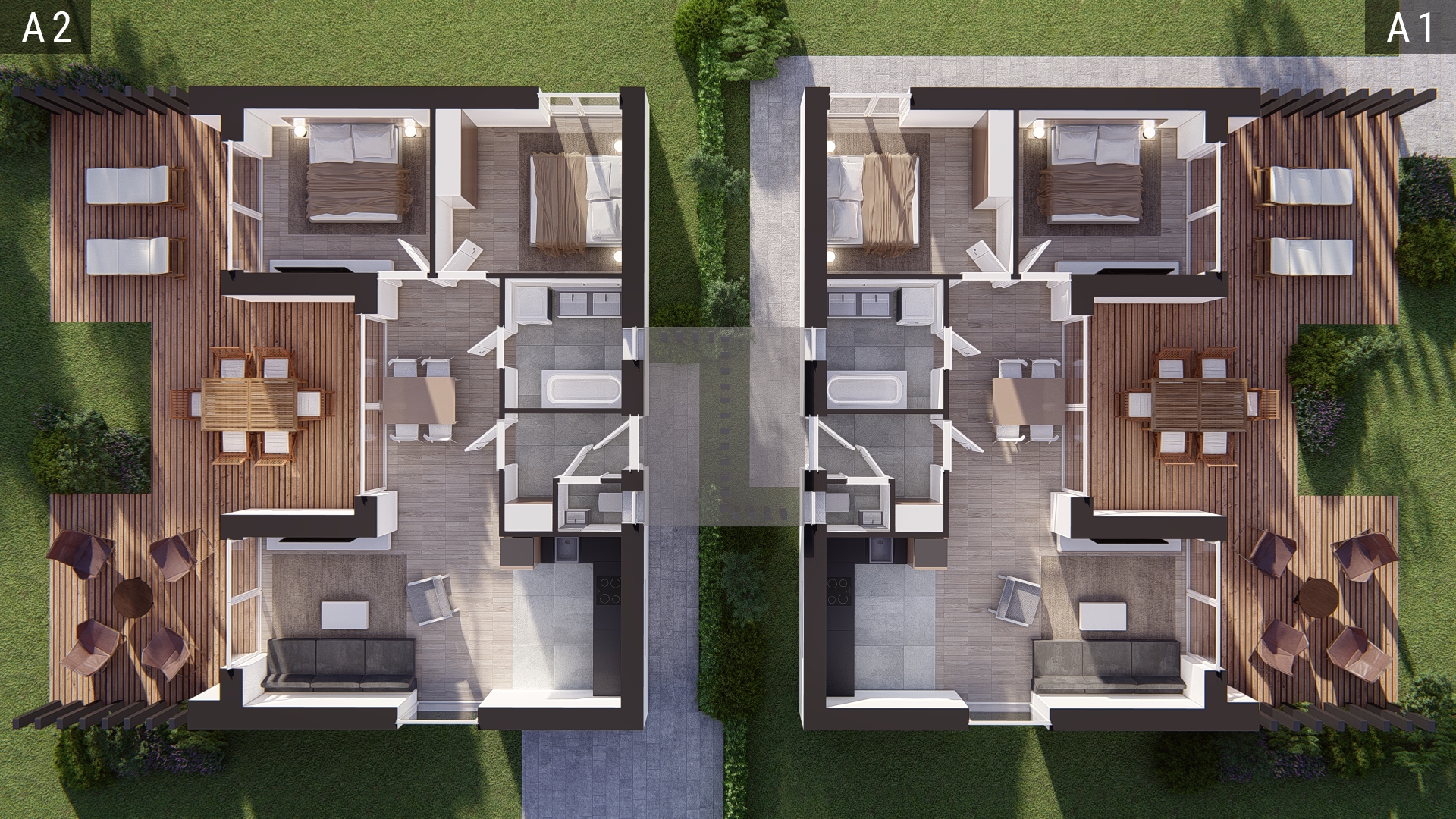 Kettő földszintes ingatlan típusból lehet választani. Illetve ugyanezen épületek emeletes formái is elérhetőek lesznek a lakóparkban, melyek alapterülete és szobaszáma is nagyobb.