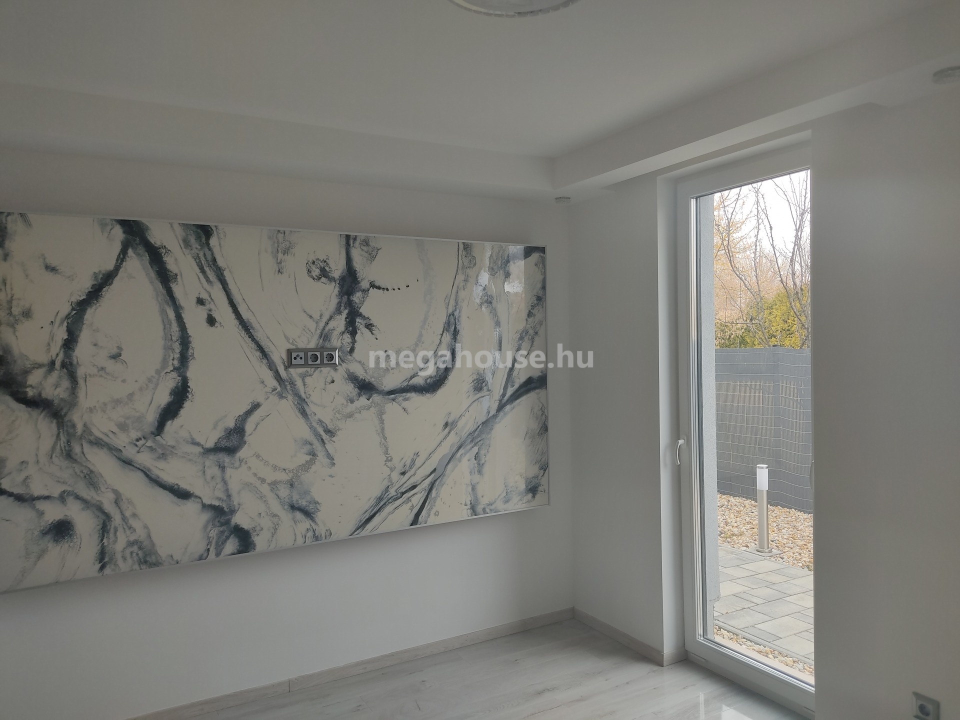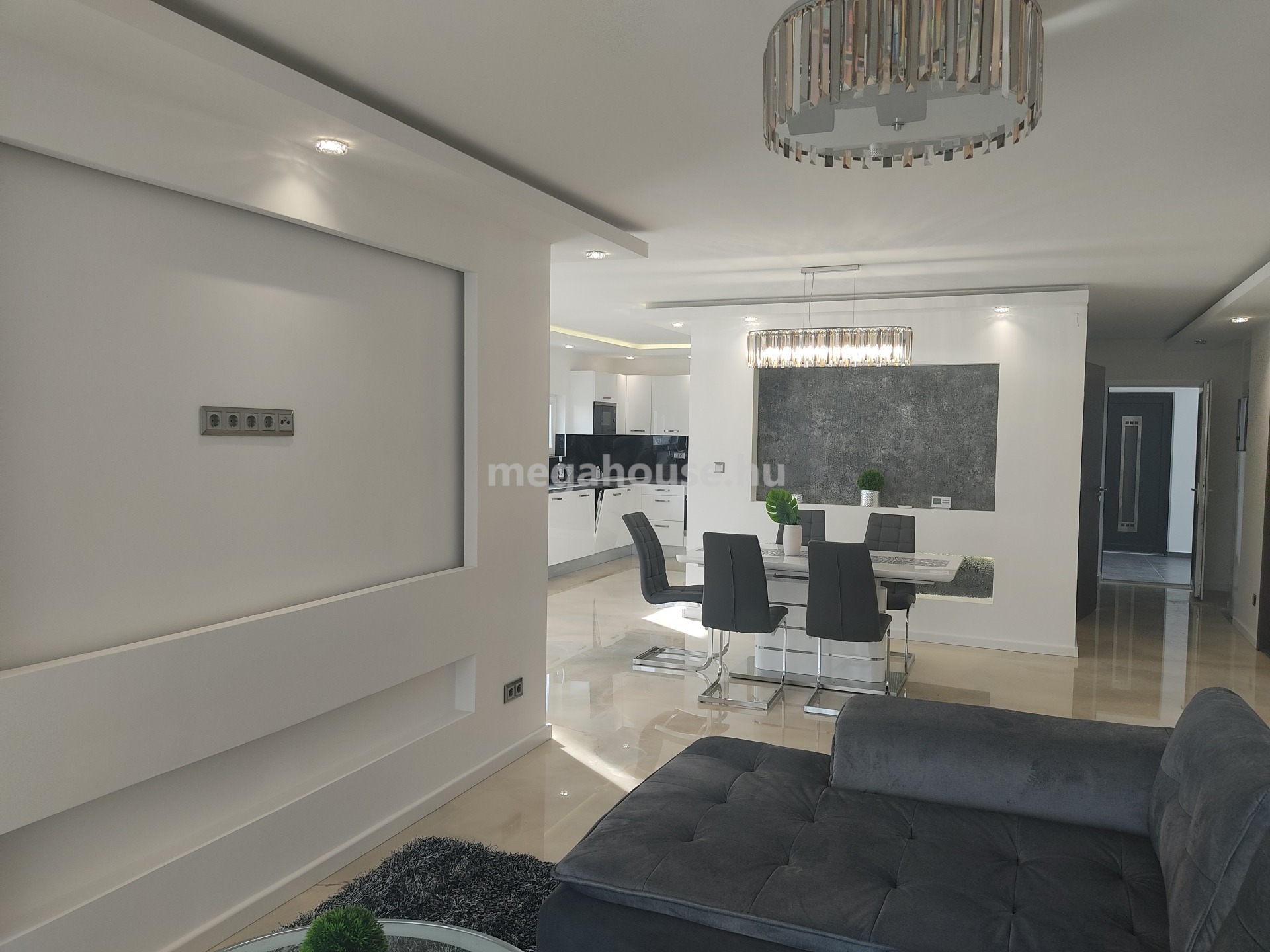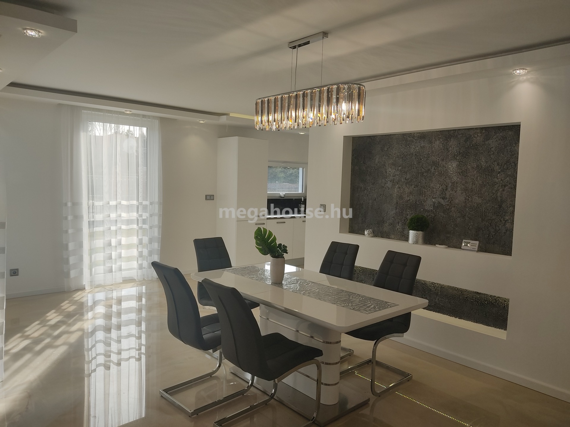 A nappali,étkező,konyha,rendkívül tágas és fényes,köszönhető a hatalmas ablak felületeknek,összesen 53 nm, melyből közvetlenül a 24 nm-es teraszon keresztül jutunk ki a kertbe.