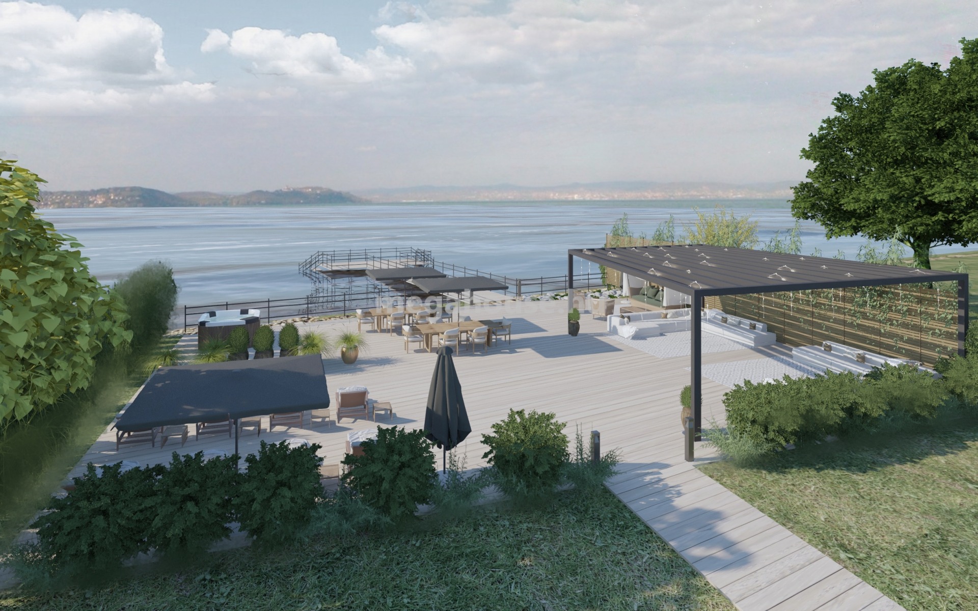 A társasházzal szemben, saját strandot alakítottak ki egy 850 négyzetméteres vízparti telken. Minden lakáshoz tartozik egy privát strand tulajdonjoga, melyet négyzetméter arányosan osztottak fel a 8 lakás között. Tervek között szerepel még egy saját stég, illetve egy medence megépítése a strand területén.